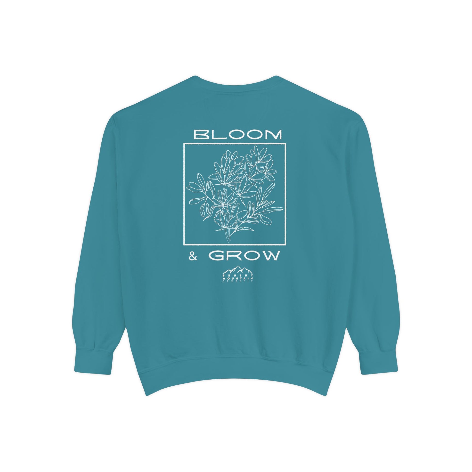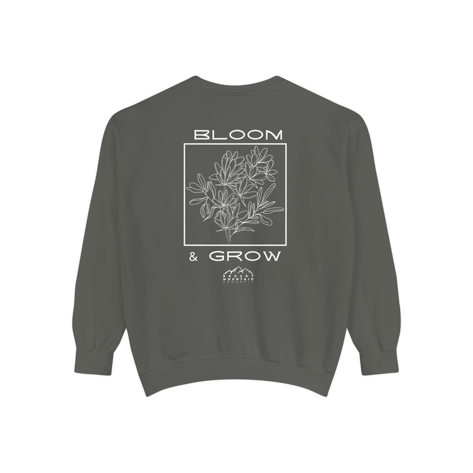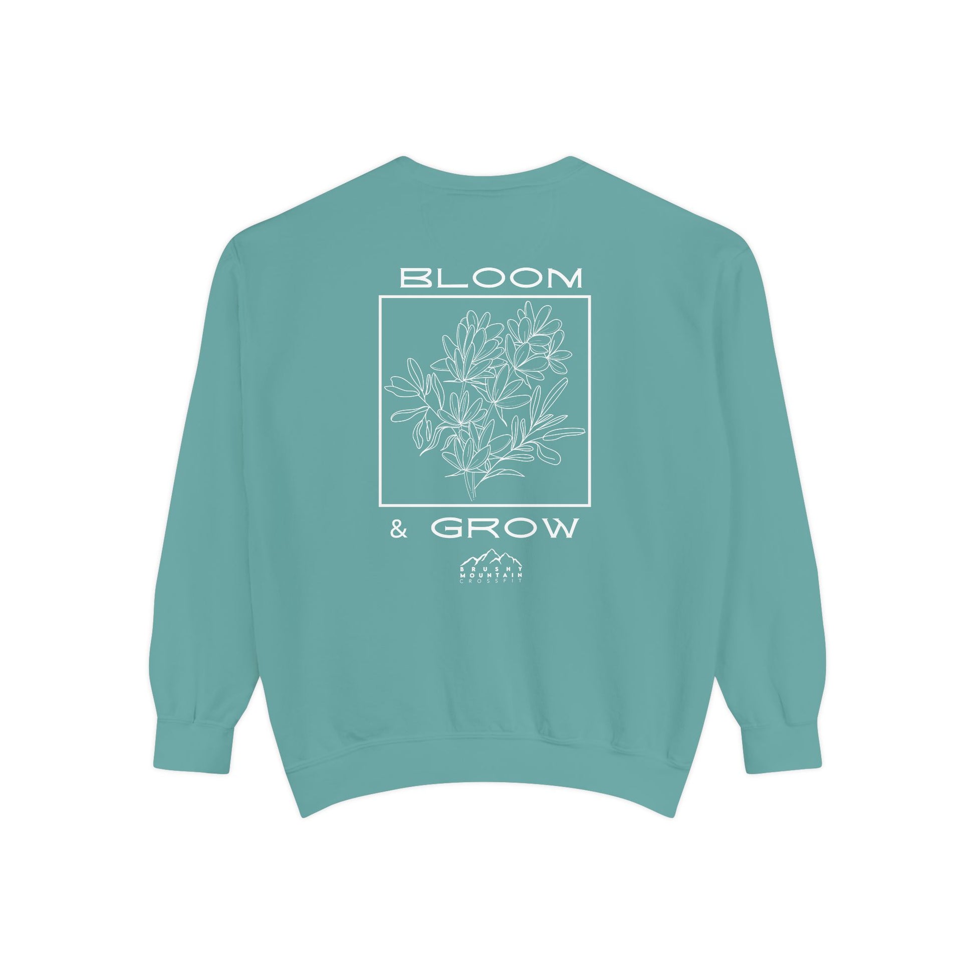 The Brushy Mountain CrossFit Bloom and Grow Comfort Colors Crew, featuring the inspirational message 'Bloom and Grow', embodies a sense of growth, strength, and empowerment.